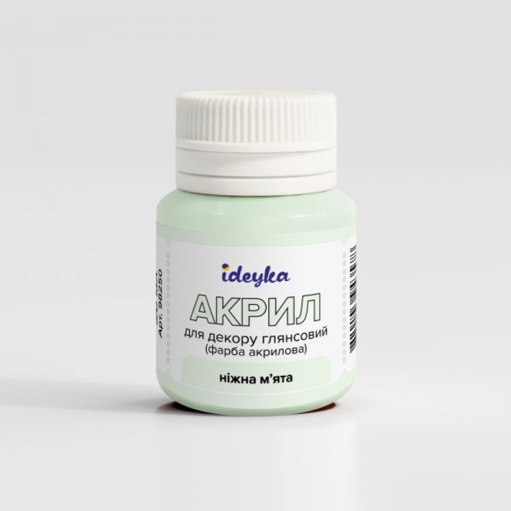 Акрилова фарба ТМ Iдейка 20мл, Ніжна м'ята (98250). Фарба екологічна, виготовлена з високоякісних органічних і неорганічних пігментів. Кремова консистенція фарби дозволяє використовувати її відразу, без додаткового розведення. Фарба рівномірно лягає і швидко висихає. Може використовуватися для нанесення на полотно, картон, папір, дерево і інші поверхні.