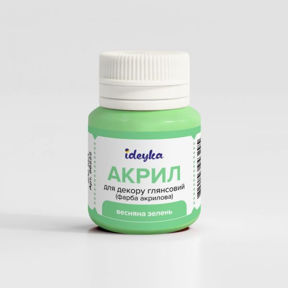Акрилова фарба ТМ Iдейка 20мл, Весняна зелень (98222). Фарба екологічна, виготовлена з високоякісних органічних і неорганічних пігментів. Кремова консистенція фарби дозволяє використовувати її відразу, без додаткового розведення. Фарба рівномірно лягає і швидко висихає. Може використовуватися для нанесення на полотно, картон, папір, дерево і інші поверхні.