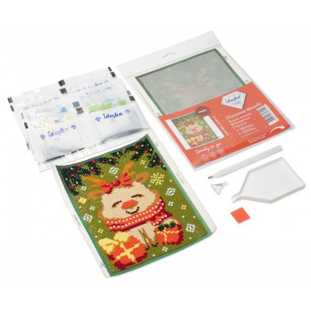 Склад набору: - полотно з клейовим шаром і кольоровою схемою без підрамника, - акрилові стрази згідно комплектації набору (круглі), - спеціальна ручка-стилус для роботи зі стразами та додаткова насадка на 6 камінчиків-стразів, - гель-клей, - лоток для сор