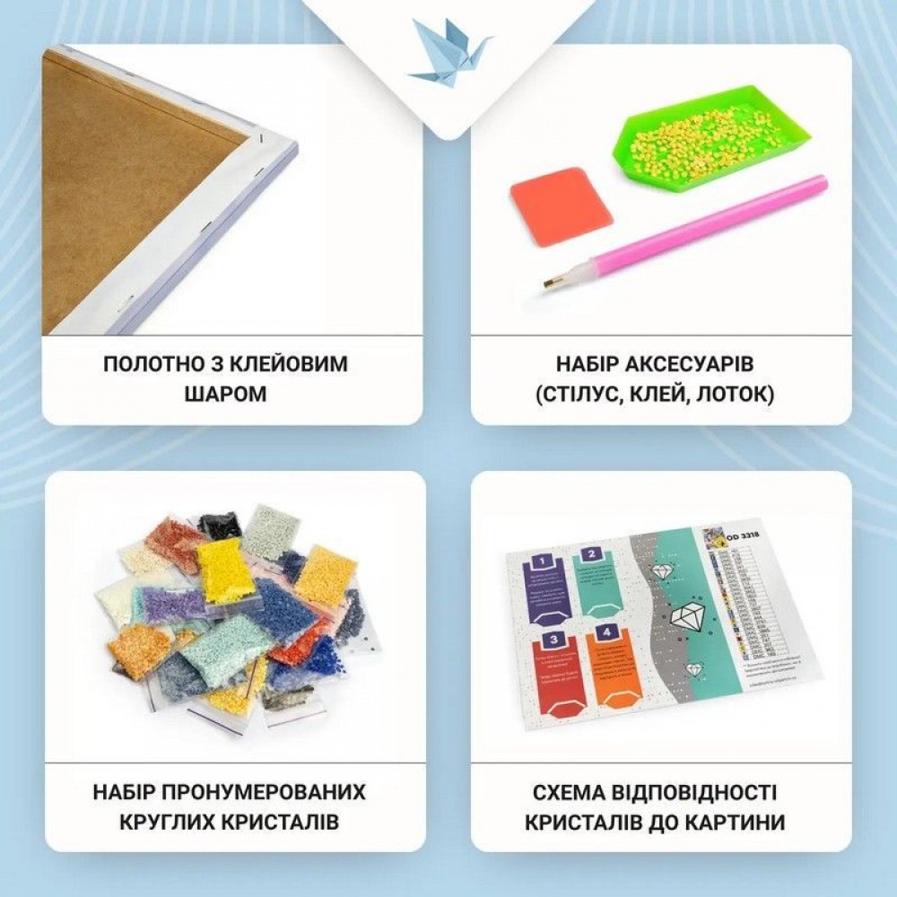 Полотно, ручка-стилус, гель-клей, акрилові стрази згідно з комплектацією набору
