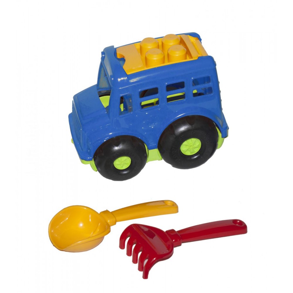 Автобус "Бусик №1" + лопатка і грабельки. Розмір лопатки - 16 см, граблі - 15 см. З цим набором дитина зможе грати як вдома, так і на вулиці.