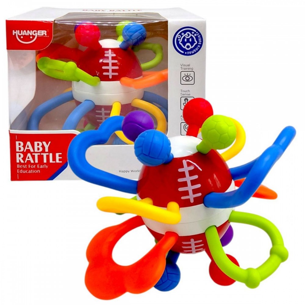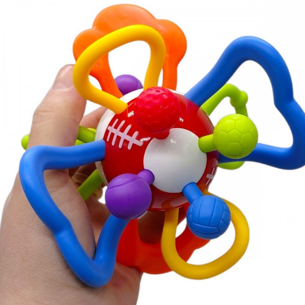 Розвиваюче брязкальце у формі м’яча - це яскрава багатофункціональна іграшка для найменших. Завдяки різнокольоровим елементам, зручній формі та рухомим деталям вона допомагає розвивати сенсорне сприйняття та дрібну моторику.