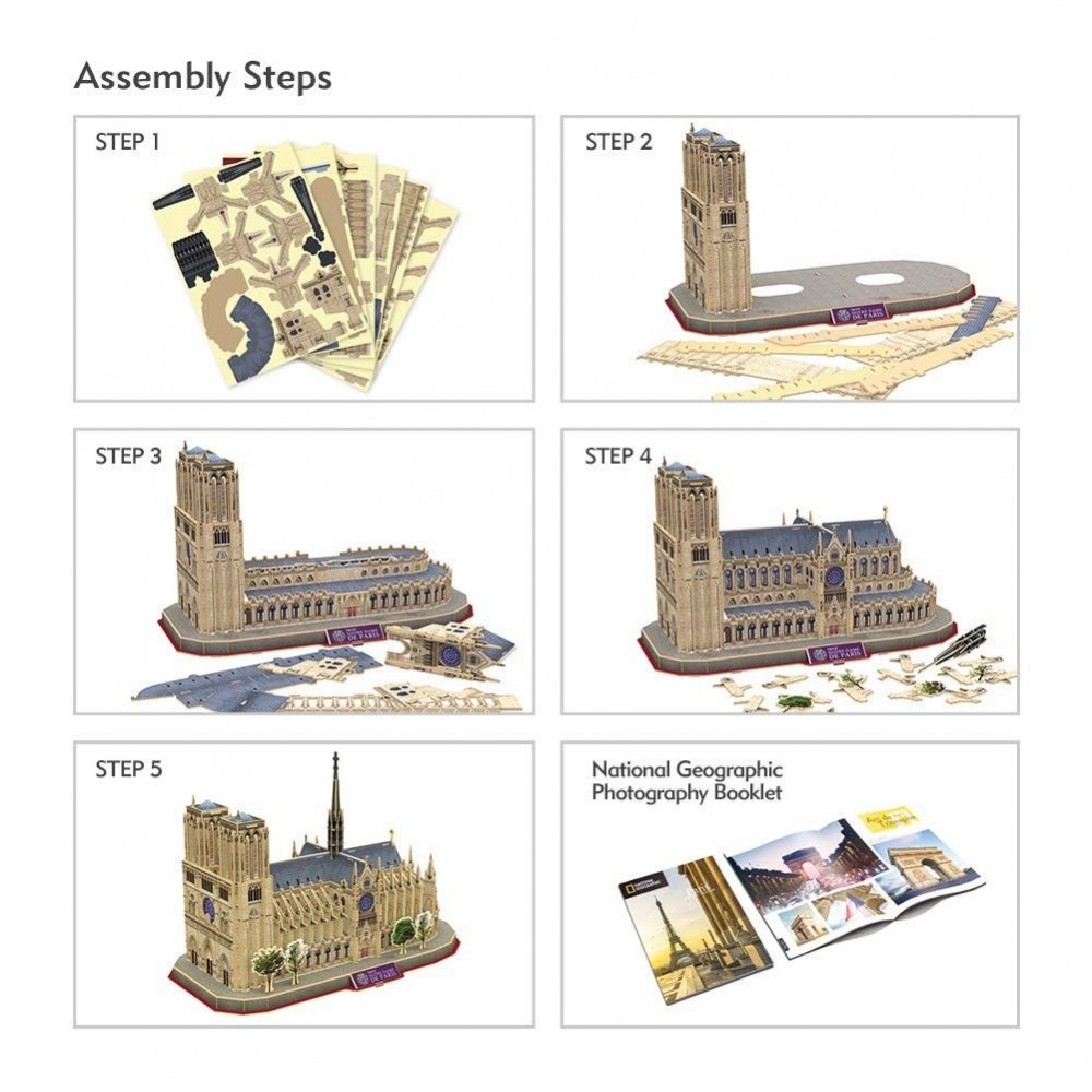 Результатом складання тривимірного пазла від компанії CubicFun стане дивовижна модель символу Парижа - Собору Паризької Богоматері. Готова модель висотою 24 см виглядає дуже реалістично, адже творці пазла пропрацювали до дрібниць кожну деталь. Виготовлені елементи пазла з пенокартона. У наборі ви знайдете 128 деталей. Найцікавіше, що для складання пазлу вам не треба буде ні клей, ні будь-які інструменти! Крім того, в наборі ви знайдете каталог з яскравими фотографіями пам'яток Парижа. Збірка об'ємних пазлів - заняття не тільки захоплююче, але і сприяє розвитку логіки, моторики та посидючості. Набір рекомендується дітям віком від 8-ми років.