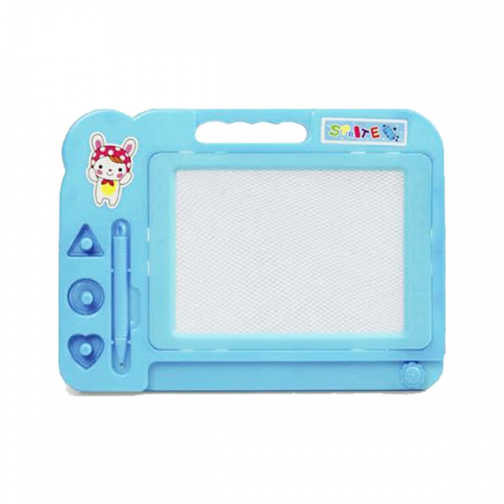 Яскрава пластикова дошка для малювання з магнітною основою. У наборі: магнітна ручка і 3 друку (у формі серця, кругла, трикутна). Готовий малюнок можна стерти, потягнувши за бігунок внизу дошки. Розмір поля для малювання - 16 х 11,5 см.