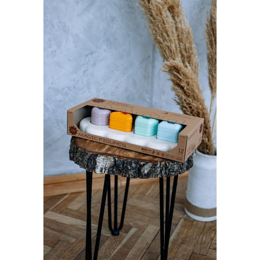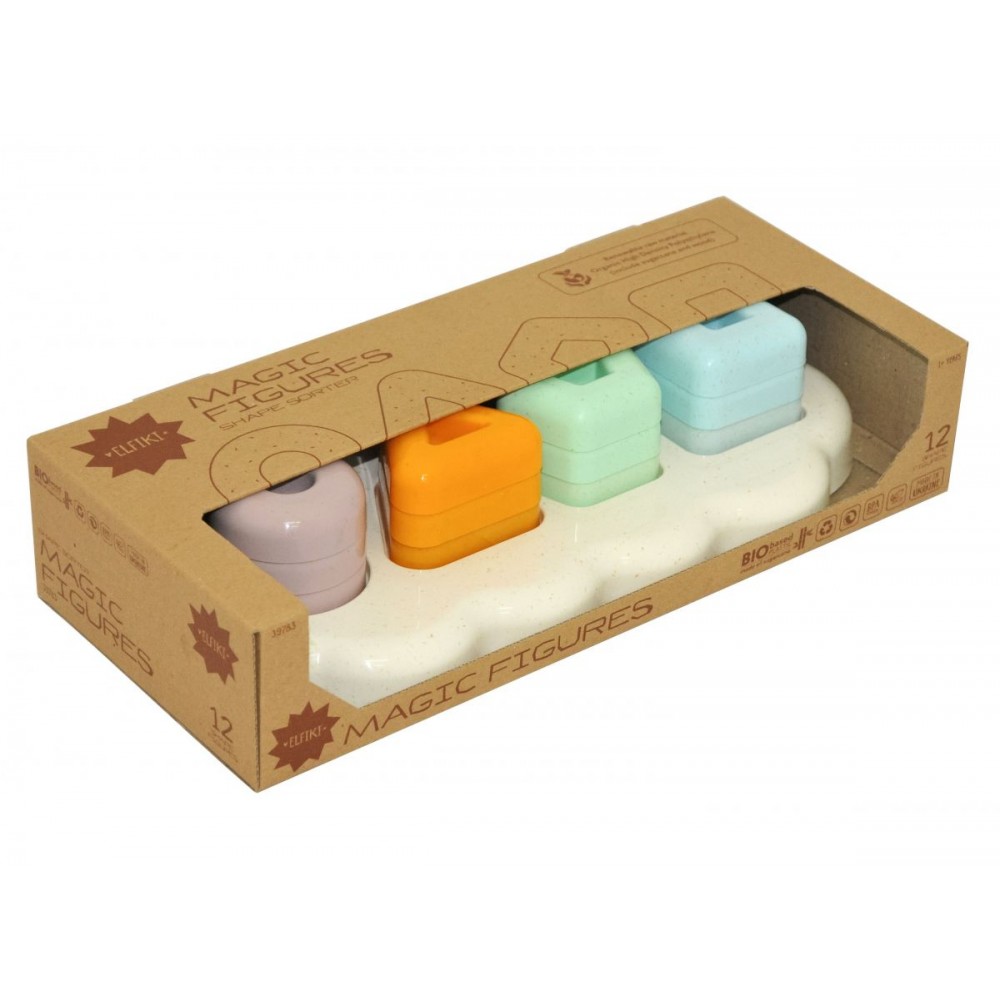 До Вашої уваги нова екологічна іграшка ТМ ELFIKI – ECO Іграшка-сортер Магічні фігурки, ELFIKI Наслідуючи передові світові екологічні тенденції компанія Тигрес, перша в Україні, випустила лінію іграшок на основі біологічної сировини. Лінія іграшок ТМ Elfiki natural - це саме ті якісні іграшки, яким діти будуть радіти протягом тривалого часу. Іграшки виготовлені з біопластику (поліетилену Green PE TM Braskem) та деревно-пластикового композиту (WPC ). - На відміну від звичайного поліетилену, зелений ПЕ виготовляється не з сирої нафти, а з цукрової тростини. Екологічна іграшка ТМ ELFIKI виготовлена ??з природних матеріалів екологічно чистим способом. Спосіб без виділення вуглецю, парникових газів або хімічних токсинів. Вони можуть потрапляти у водні шляхи та навколишнє середовище. - Поліетилен на біологічній основі (Bio-PE) підходить для екструзії, лиття під тиском і видувного формування та на 100% придатний для вторинної переробки (100% recycled). - З екологічно чистим поліетиленом Green PE та WPC висока якість матеріалу може бути оптимально поєднана з безпекою, екологічністю та можливістю переробки. Іграшки мають пастельний колір з вкрапленнями деревинита приємний натуральний запах деревини. ми виробляємо іграшки без клею та шурупів. Всі елементи мають заокруглену форму, великі елементи зручні для маленьких ручок. Деталі можна обмальовувати на папері. Граючи, малюк зможе побудувати з фігурок 4 вежі різної форми та кольору, підбираючи відповідний отвір для розташування фігурки. Гра корисна для розвитку просторового мислення, інтелекту і уваги дитини, моторики ручок, координації і спритності рухів. Допомагає вивчати елементарні фігури та кольори. В набір входить 12 фішок. По 3 шт кожного кольору. Упаковка – відкрита коробка з крафт картону.