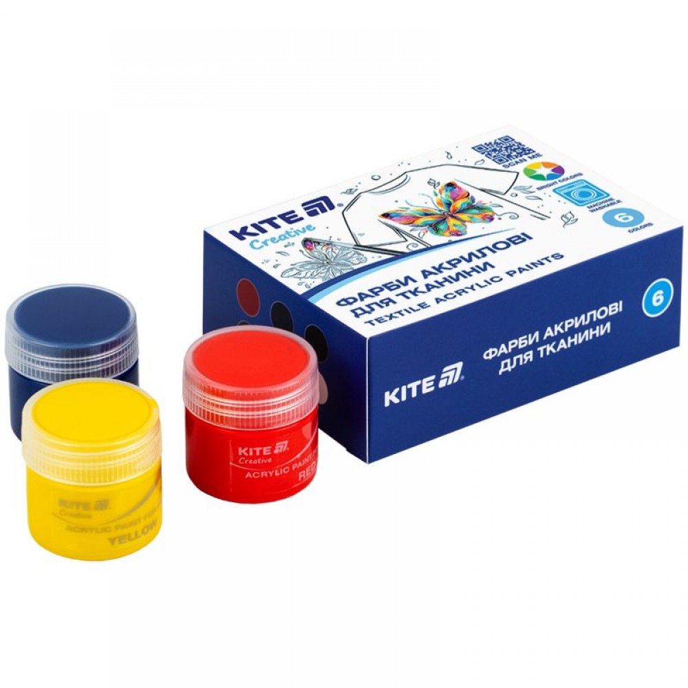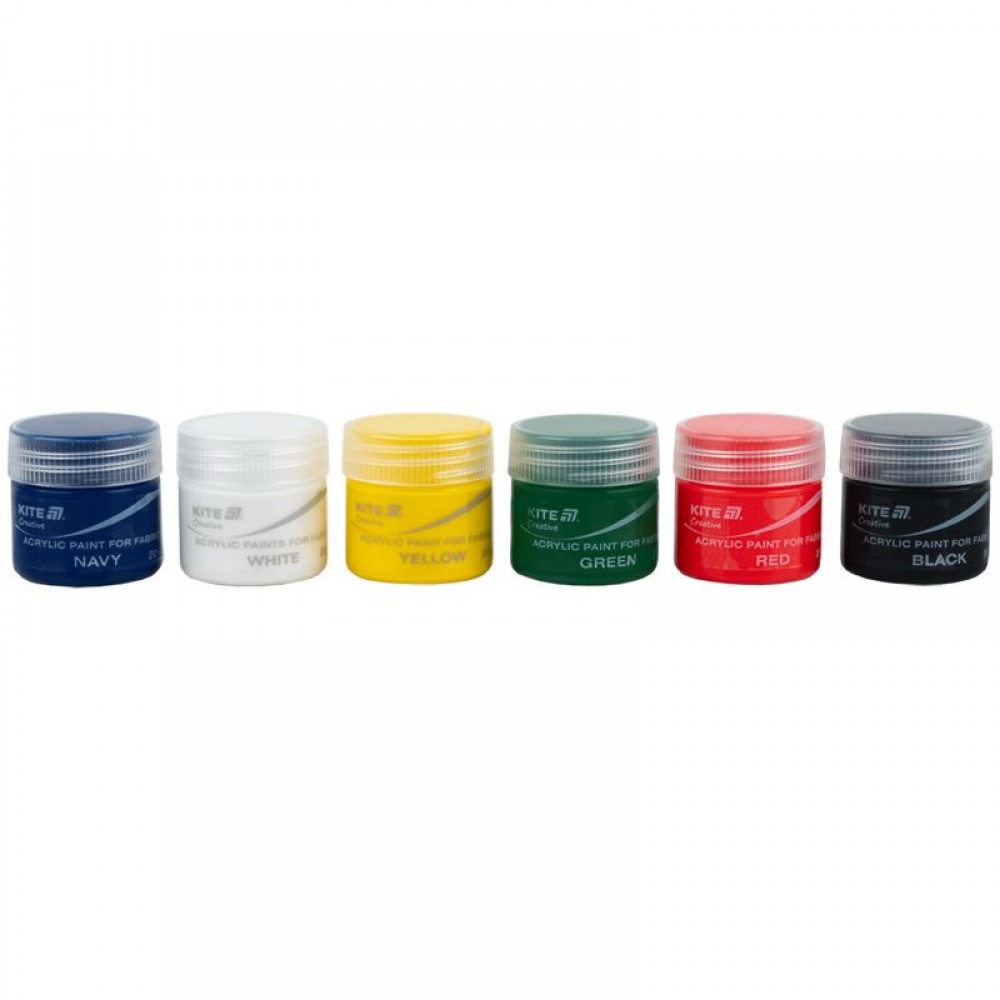 Акрилові фарби для тканини Kite Creative K-277, 6 кольорів — набір для натхненної творчості. Розкрийте свій креатив разом із Kite Creative. Фарби для тканини ідеально підходять для декорування натуральних (бавовна, льон, шовк, віскоза) та змішаних тканин, що містять до 20-30% синтетичних волокон. Яскраві, насичені кольори допоможуть створити неповторний дизайн на футболках, сумках, аксесуарах та інших виробах. Створюйте унікальні речі своїми руками. Ваша уява — головний дизайнер! Просто візьміть пензлик і створіть щось нове. Фарби Kite Creative допоможуть втілити найзаповітніші задуми! Фарби легко наносяться на суху та чисту тканину, малюнки виходять яскравими та насиченими.