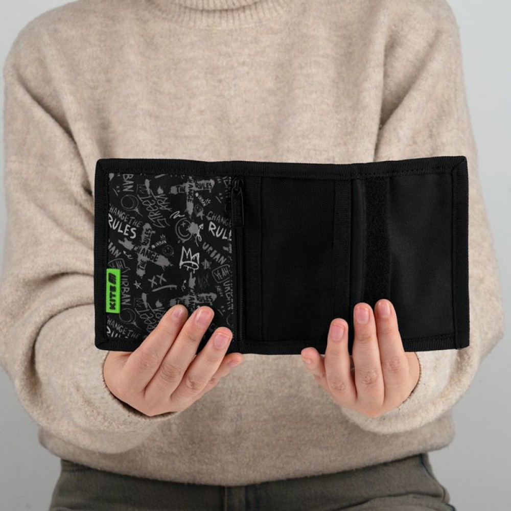 Гаманець зовні: 1 відділення; 1 зовнішня кишеня на блискавці з сіточкою; зносостійкі блискавки; надійна фурнітура. Гаманець всередині: 5 кишень для карток; кишеня для монет на липуці; ключниця. Декор: сублімаційний друк.