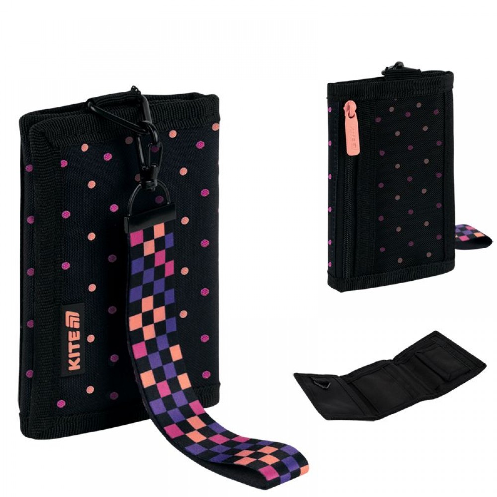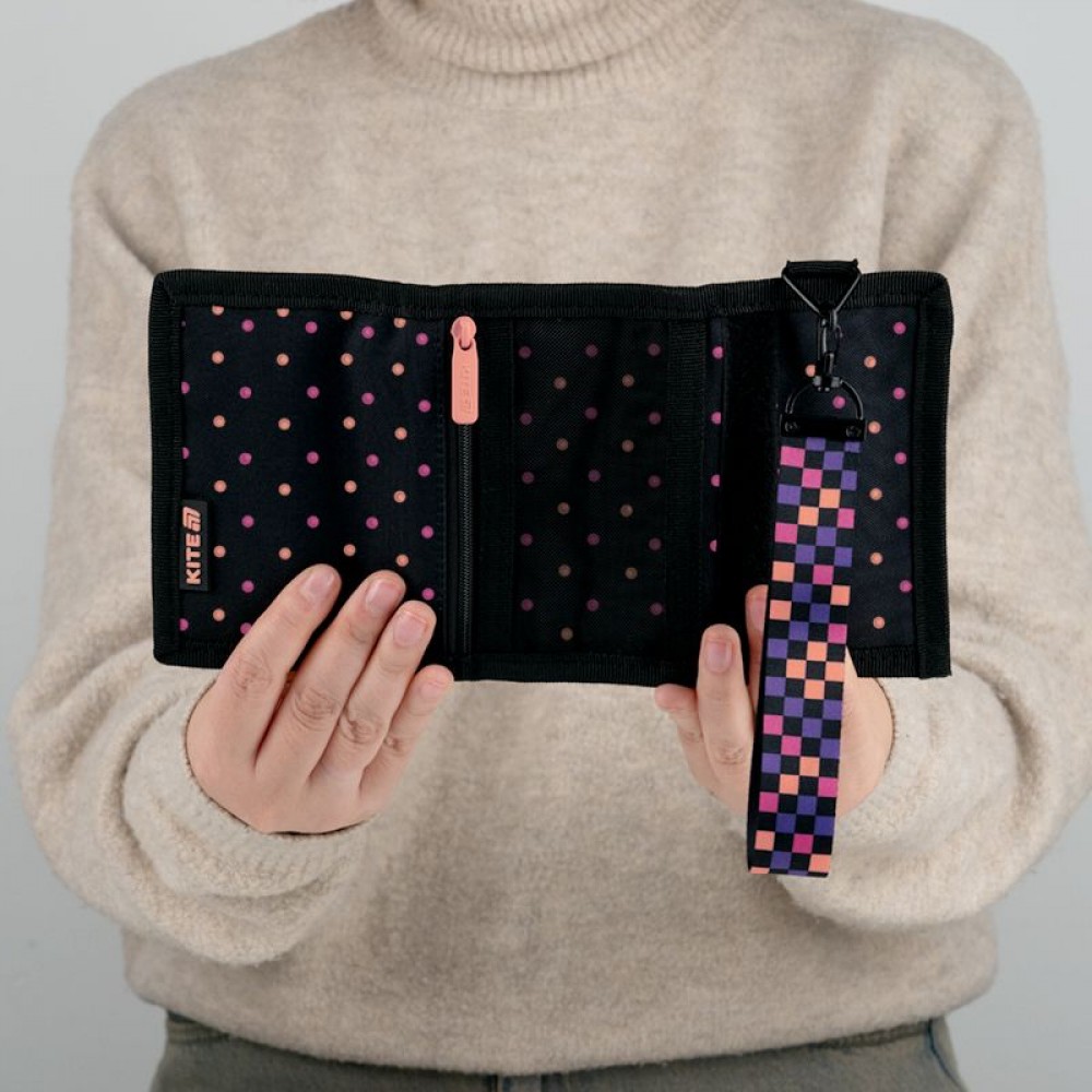 Гаманець зовні: 1 відділення; 1 зовнішня кишеня на блискавці з сіточкою; зносостійкі блискавки; надійна фурнітура. Гаманець всередині: 5 кишень для карток; кишеня для монет на липуці; ключниця. Декор: сублімаційний друк, підвіска з тасьми на металевому карабіні.