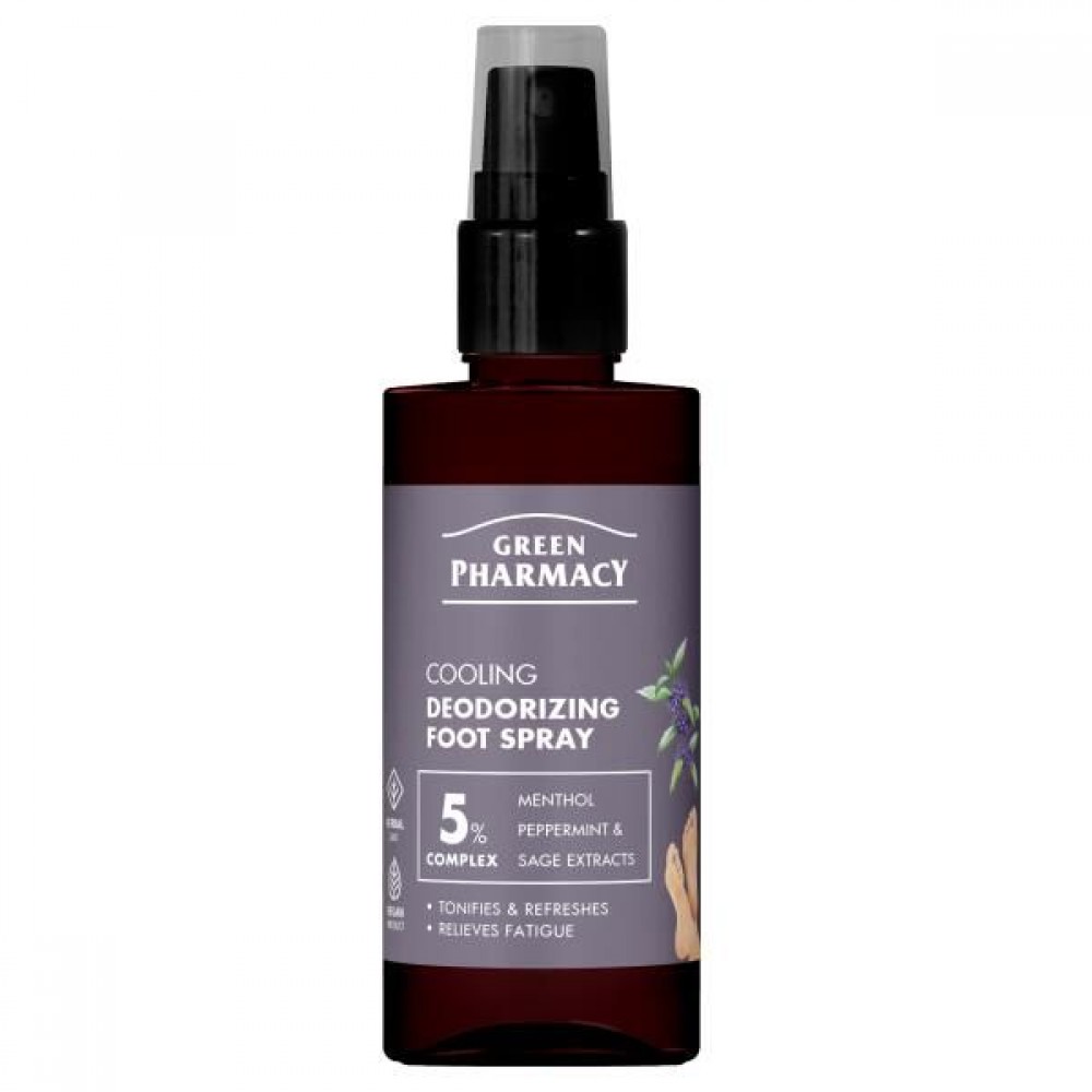 Дезодоруючий спрей для ніг Green Pharmacy Охолоджувальний — це ідеальний засіб для щоденного догляду за ногами, який допомагає боротися з неприємними відчуттями втоми, надмірною пітливістю та запахом. Завдяки унікальній формулі з 5%-м комплексом активних компонентів, до складу якого входять ментол, екстракти перцевої м’яти та шавлії, спрей миттєво освіжає, охолоджує і тонізує шкіру стоп.