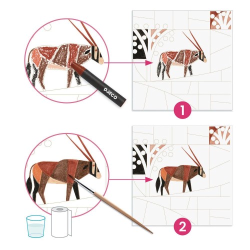 - 4 ілюстровані картки (20 х 20 см); - 12 акварельних воскових олівців; - 1 пензлик; - 1 кольоровий буклет з покроковими поясненнями.