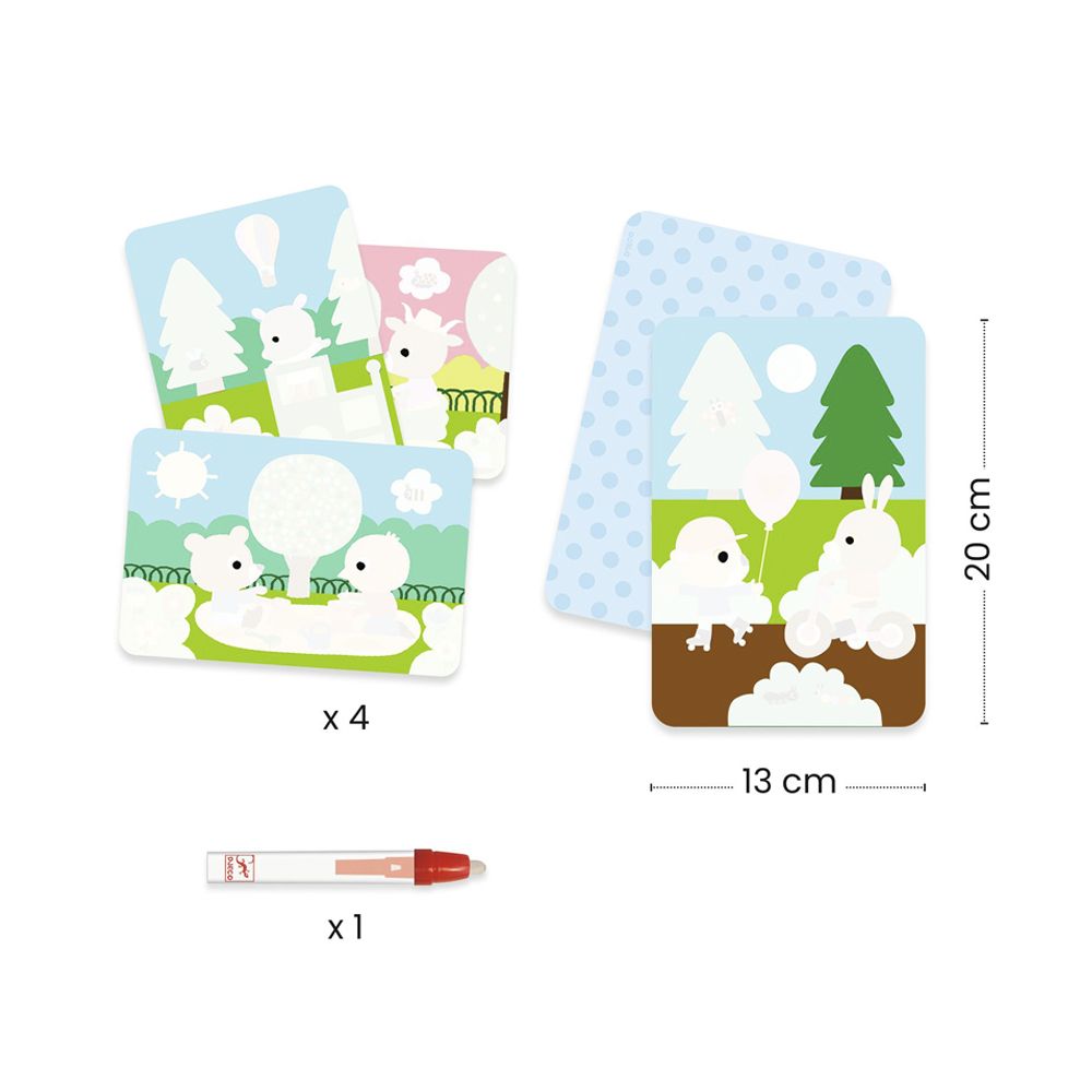 - 4 ілюстровані карти з м’якого пластику з білим шаром; - 1 олівець із ємністю для води; - основа із товстого картону.