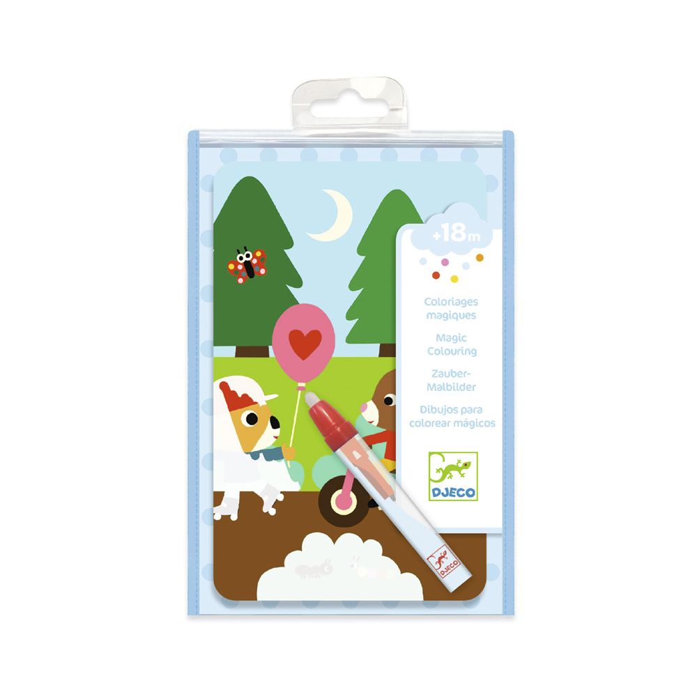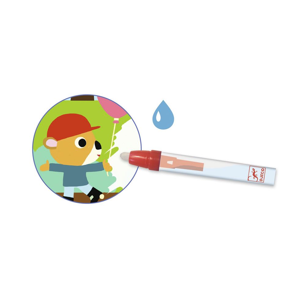 Художній комплект для малювання водою DJECO У парку це творча техніка, яка дозволяє вам малювати без використання фарб. Вам лише потрібно нанести воду на спеціальні картинки за допомогою олівця, і перед вашими очима з’явиться справжнє диво. Фарби будуть розфарбовані та оживуть, створюючи яскраві та реалістичні образи.