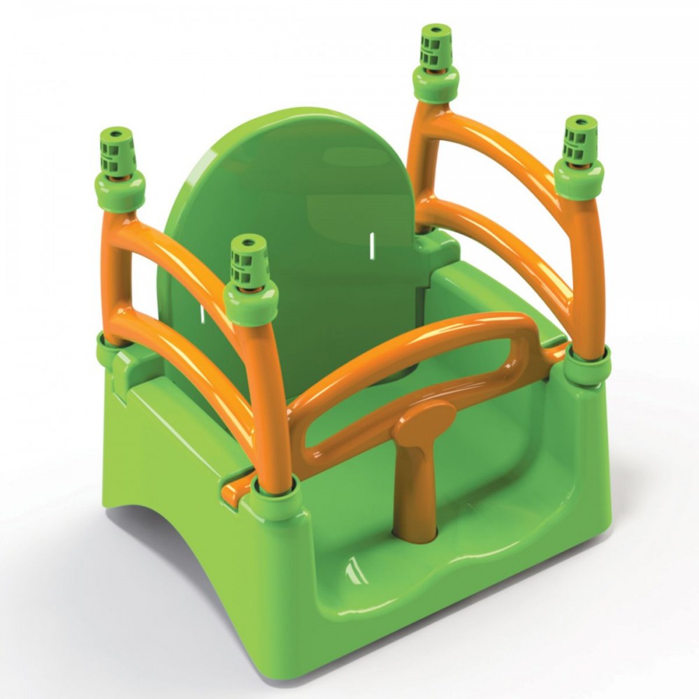 Пластикова дитяча гойдалка 3 в 1. Її можна встановити як у приміщенні, так і на вулиці. Має 3 положення: 1) зі спинкою, ремінцем та Т-подібною планкою для ніжок; 2) зі спинкою та ремінцем; 3) без спинки, ремінця та планки. Максимальне навантаження – 30 кг. Неводостійка. Інструкція у комплекті.