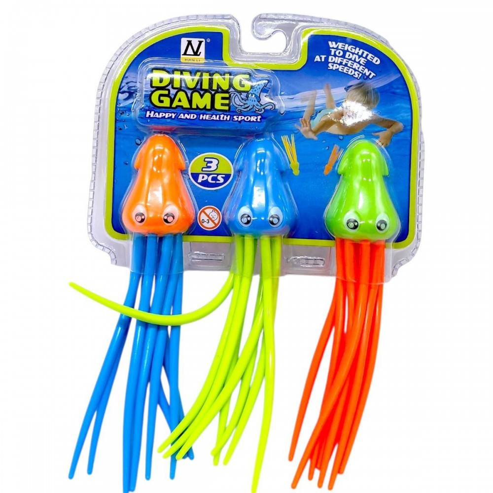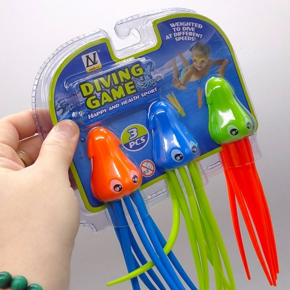 Іграшка для води у вигляді кальмарів — набір для активних ігор у басейні або водоймі. Фігурки занурюються у воду та стимулюють дитину пірнати й діставати їх. Яскраві кольори добре видно під водою, а м’які елементи безпечні у використанні. Підходить для дітей, розвиває координацію та інтерес до рухливих ігор.