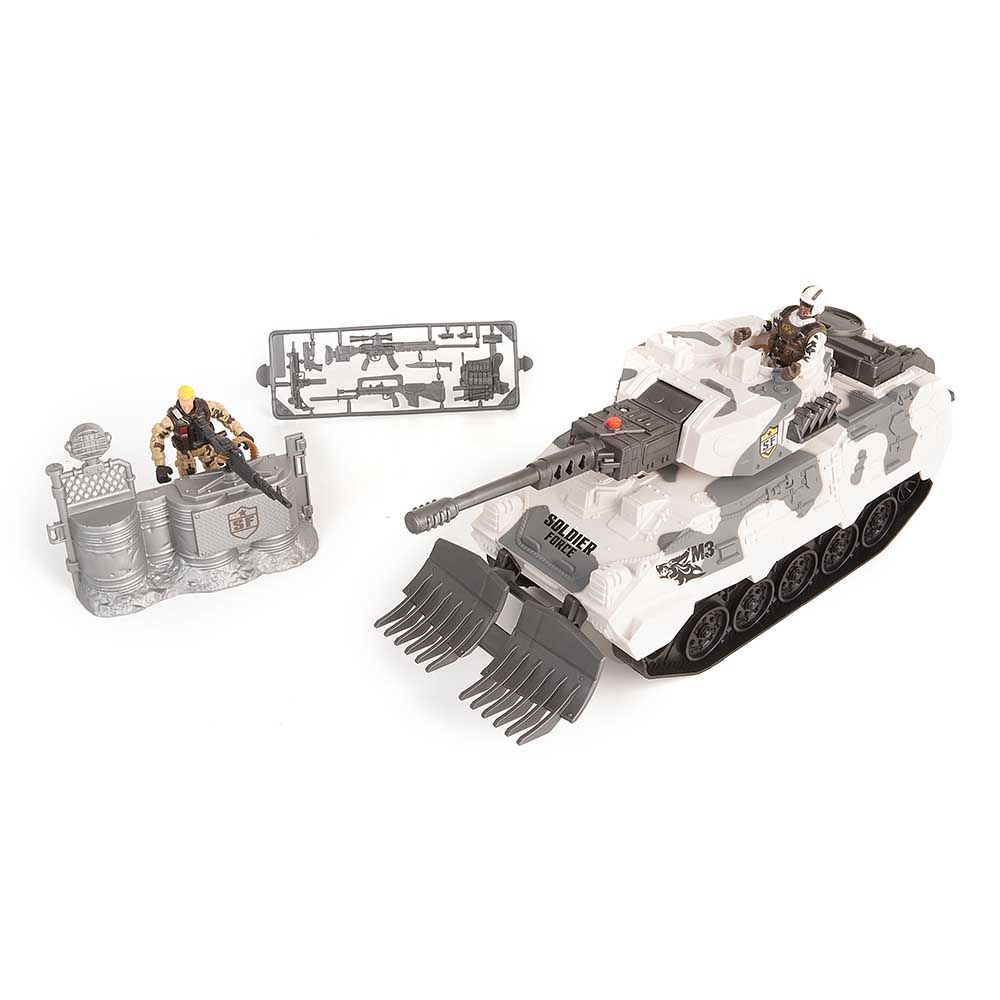Ігровий набір Солдати DESERT TANK Основні компоненти: Іграшка Танк з світловим та звуковим ефектом - 1шт. (Батарейки типу AG13 / LR44 - 2 шт. В комплекті) Іграшка Бар'єр - 1 шт. Фігурка (Солдатик) - 1 шт. аксесуари функції: Світловий і звуковий ефект танка