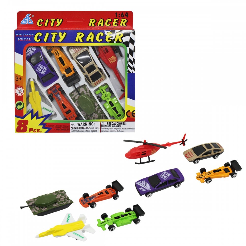 Набір із восьми транспортних засобів обов'язково порадує дитину. У наборі є літак, 3 гоночні машинки, танк, легкова машина, спортивна машина та вертоліт. Набір виконаний з якісних та безпечних матеріалів, для дітей від 3-х років.