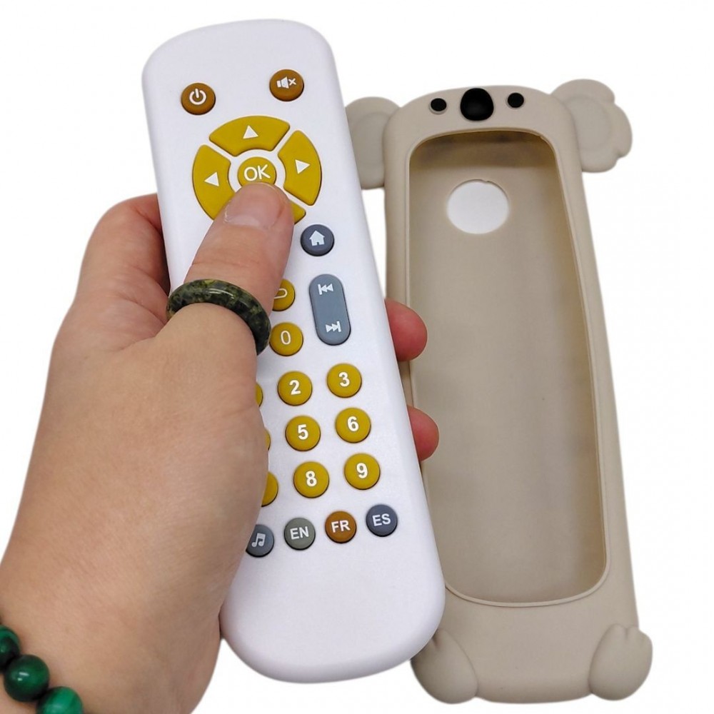 Кумедний ігровий пульт допоможе малюкові весело вивчати звуки, мелодії, мови та цифри. Завдяки підсвічуванню як у справжньому пульті, музичним режимам та різним мовам озвучування дитина із захопленням натискатиме кнопочки, вивчатиме нові звуки та повторюватиме цифри. Мʼякі гумові кнопки зручні для маленьких пальчиків, а яскравий дизайн робить гру ще приємнішою. Такий пульт відмінно підходить для розвитку сенсорики, уваги та раннього навчання. Озвучування цифр англійською, іспанською та французькою мовами; Розмір пульта: 5,5 х17 см; Кнопка з нотою слугує перемикачем режимів звуку; Поміщений у гумовий чохол у вигляді звірятка. Працює від 2 батарейок типу ААА (у комплект не входять).