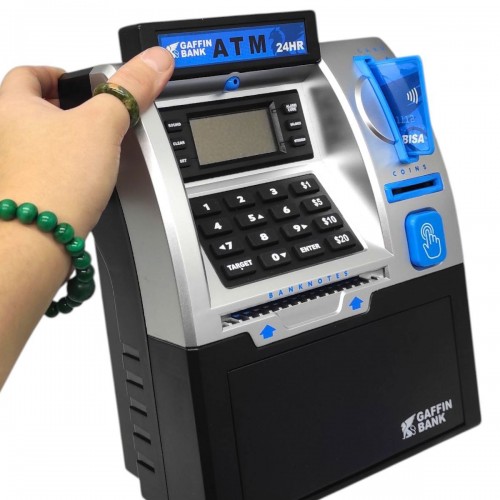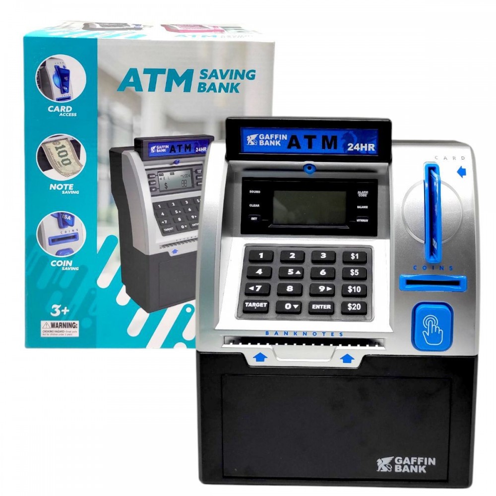 Ця цікава та багатофункціональна скарбничка надійно збереже фінанси вашого малюка! Іграшка є стилізованою під банкомат, а до набору навіть додано іграшкові гроші та банківську карту. Так ваша дитина навчиться відповідально ставитися до грошей та отримає основи навичок користування банкоматом. В комплекті присутня інструкція англійською мовою, з попроковими інструкціями того як працюють функції банкомата. Дефолтним паролем для відкриття сейфа є 0000. Іграшка підсвічується та має звукові ефекти для кожного натискання на кнопку, ніби справжній банкомат.