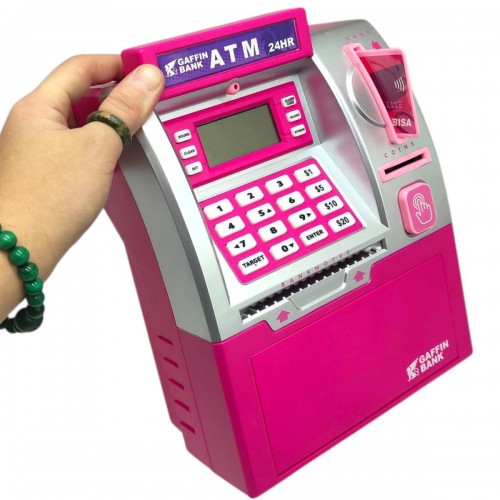 Ця цікава та багатофункціональна скарбничка надійно збереже фінанси вашого малюка! Іграшка є стилізованою під банкомат, а до набору навіть додано іграшкові гроші та банківську карту. Так ваша дитина навчиться відповідально ставитися до грошей та отримає основи навичок користування банкоматом. В комплекті присутня інструкція англійською мовою, з попроковими інструкціями того як працюють функції банкомата. Дефолтним паролем для відкриття сейфа є 0000. Іграшка підсвічується та має звукові ефекти для кожного натискання на кнопку, ніби справжній банкомат.