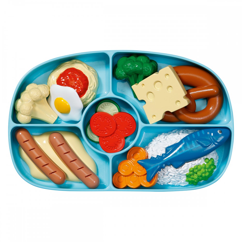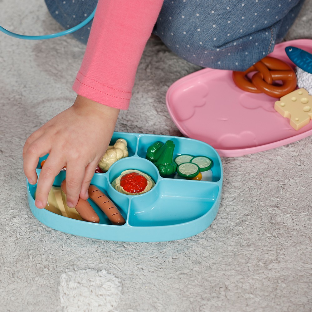 - іграшкова їжа: 3 десерти, основні страви, овочі, пляшечка з напоєм,