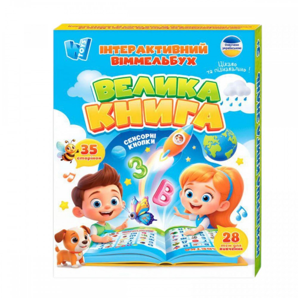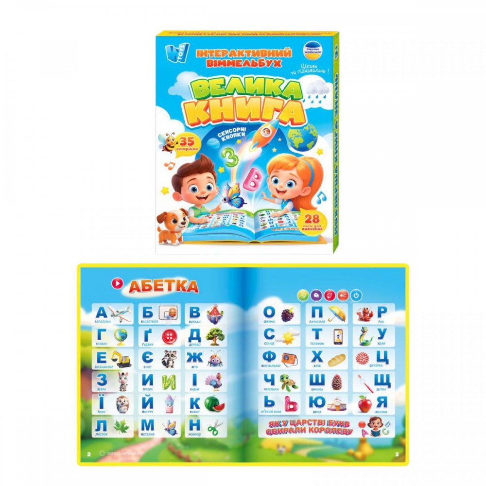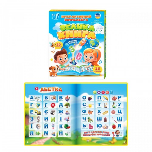 Інтернет-магазин eToys пропонує вашій увазі товар "Інтерактивний віммельбух "Велика книга", сенсорні кнопки, абетка, казки, пісні, загадки, вікторина, 28 тем, в коробці" за ціною 751 грн..