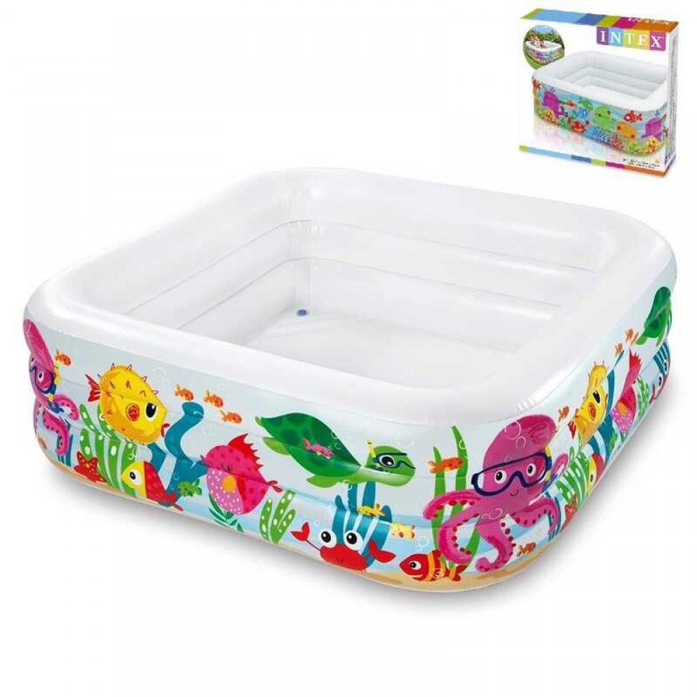 Дитячий басейн «Акваріум» - це багато годин веселих ігор у воді. Яскравий принт надувного виробу, що зображає картину підводного світу з різнокольоровими рибками, медузами, коралами, восьминогами та іншими морськими мешканцями, припаде до смаку маленьким дітям. Басейн складається з 3-х самостійних повітряних камер, кожна з яких обладнана власним подвійним клапаном.