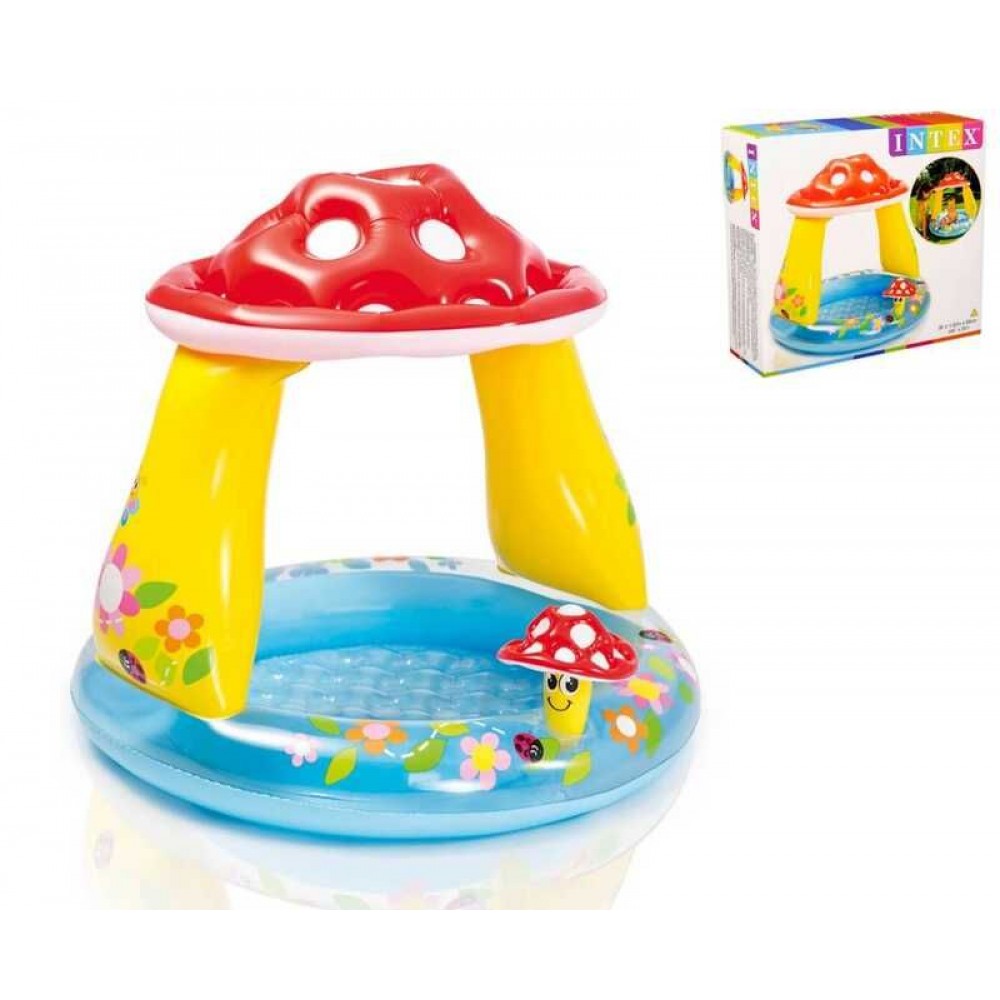 Дитячий надувний басейн Intex Грибочок 57114 являє собою невеликий блакитний басейн з яскравим навісом у вигляді мухомора.