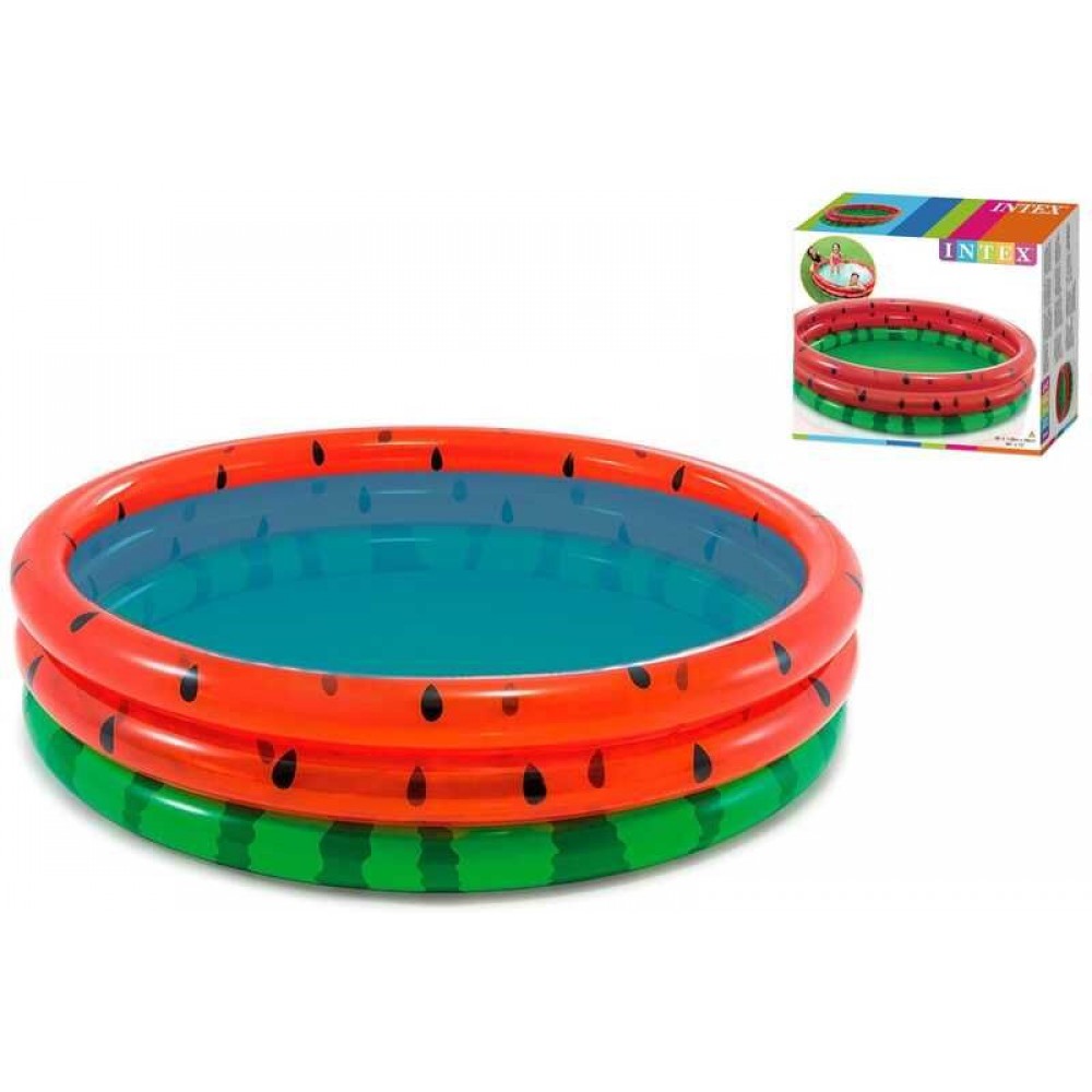 Дитячий надувний басейн «Кавун» від Intex стане улюбленою іграшкою вашої дитини. Іграшка призначена для дітей у віці від двох років. Басейн виконаний у вигляді кілець в яскравому реалістичному малюнку, передавальному кольору кавуна. Матеріал виготовлення - високоякісний ПВХ, дно не надувне. Надувний басейн має наступні характеристики: · Діаметр - 168 см · Висота - 38 см · Товщина - 0,18 мм · Обсяг - 581 л (при наповненні на 80%) Басейн підходить для водних розваг та ігор з урахуванням вікових особливостей дитини. У басейні малюк може купатися, весело проводити час з батьками та з друзями. Басейн «Кавун» простий в установці та транспортуванні, що робить можливим його використання на природі й в заміському будинку.