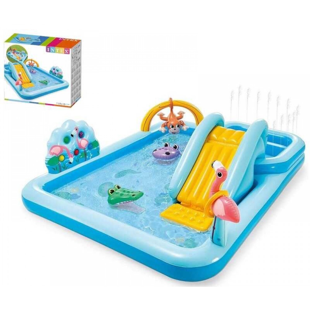Басейн призначений для дітей віком від трьох років. Іграшка є два басейни в одному. Дитячий ігровий надувний центр відкритого типу виконаний у формі прямокутника, в ньому є надувна гірка, кульки, надувні пальми, фламінго, мавпа. Крім того, конструкція басейну виконана таким чином, що маленькі витівники можуть не тільки весело проводити час, поринаючи в басейн, але й грати в кільця та кульки. Для цих цілей на передній частині басейну передбачена кумедна мордочка.