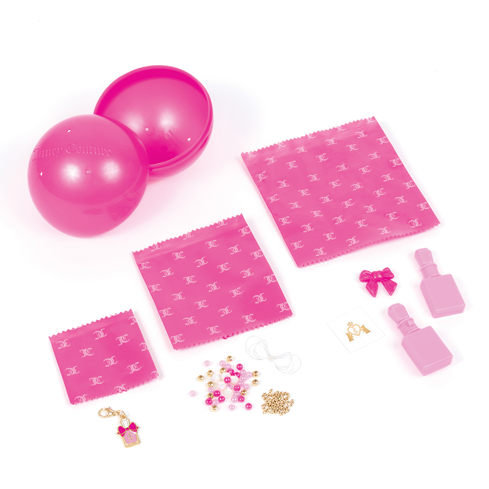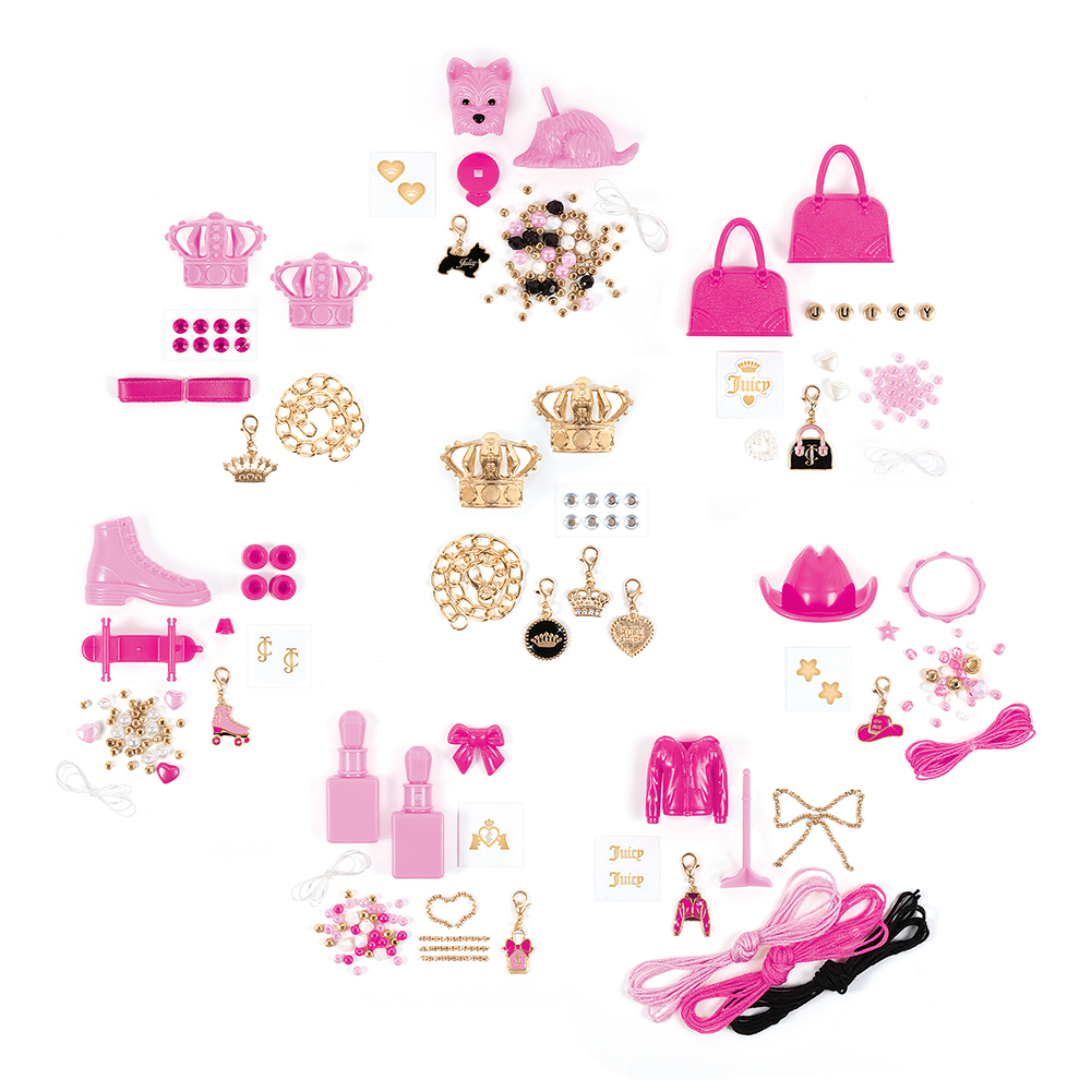 Набір-сюрприз для створення шарм-браслетів "Ікона стилю" від Juicy Couture дозволяє створювати стильні браслети, використовуючи різноманітні деталі, які заховані в яскравій упаковці. У комплект входять пластикові елементи, прикраси, перлинки та додаткові аксесуари для створення унікальних прикрас. Кожен з 8 наборів містить кілька різних дизайнів шармів, включаючи маленькі сумочки, песика, роликові ковзани й інші аксесуари, а також рідкісну золоту корону, що символізують розкішний стиль бренду.Цей набір чудово підходить для створення персональних аксесуарів, які можна носити або використовувати як подарунки. Розмір дисплея 28.5 x 17.5 x 25.5 см. В дисплеї 18 наборів.