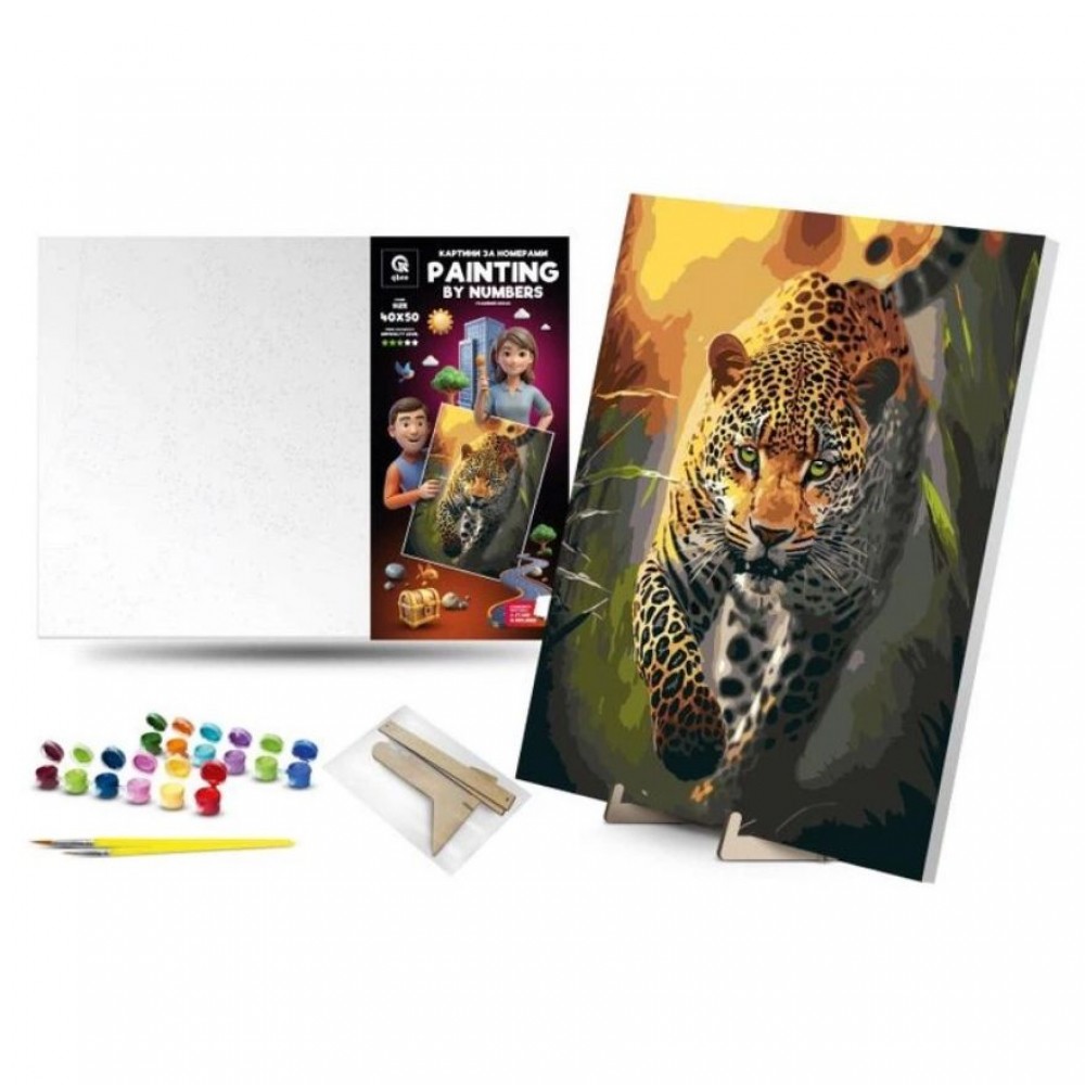 Дитяча картина за номерами. Для того, щоб намалювати картину, необхідно малювати за пронумерованими контурами, які відповідають кольору фарби. У наборі: полотно на підрамнику з галерейною натяжкою, художні нейлонові пензлі, палітра акрилових фарб у контейнерах, деревʼяні деталі підставки для картини. Усі необхідні фарби вже в комплекті та не вимагають змішування. Розмір: 4050 см. Рекомендовано для дітей старше 5 років.