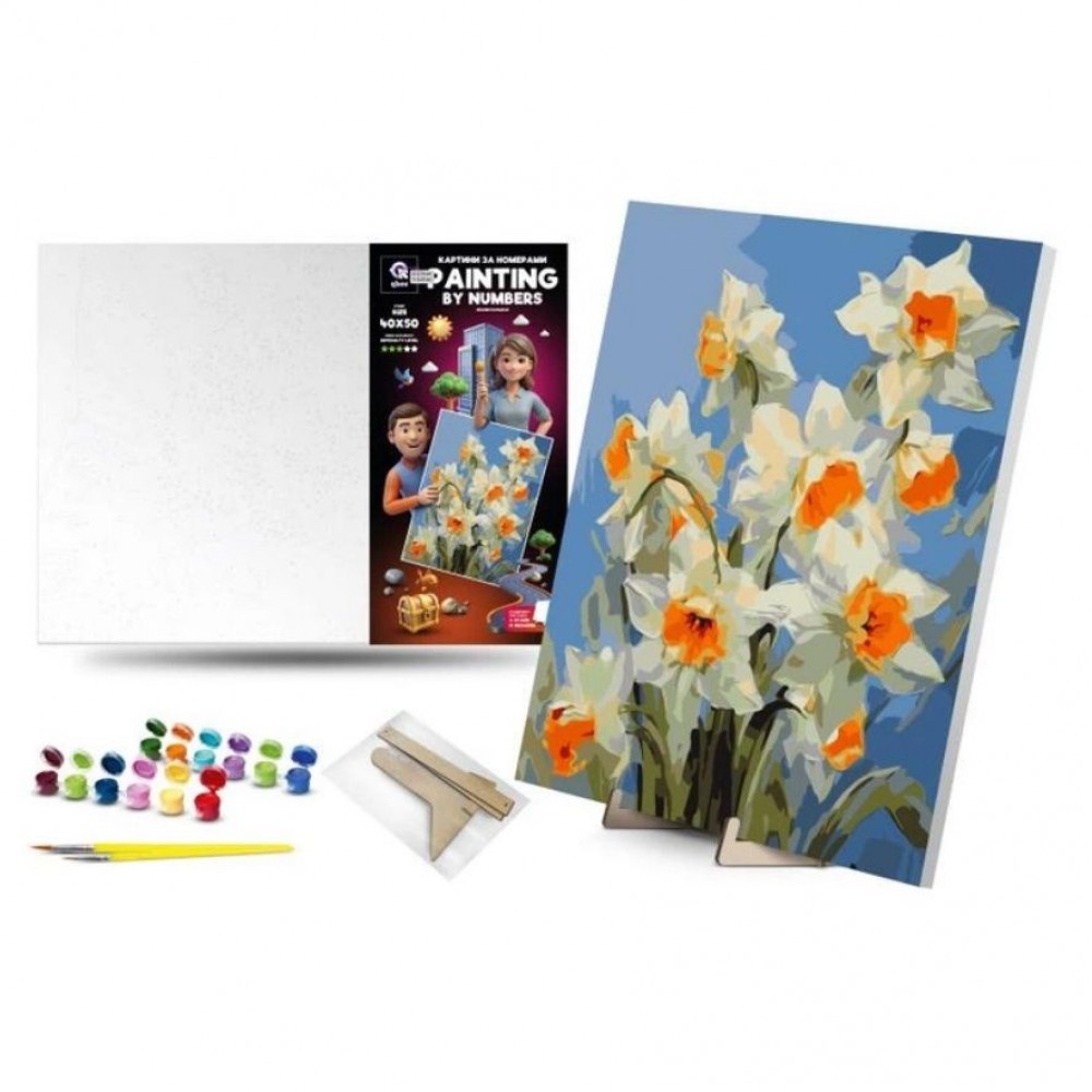 Дитяча картина за номерами. Для того, щоб намалювати картину, необхідно малювати за пронумерованими контурами, які відповідають кольору фарби. У наборі: полотно на підрамнику з галерейною натяжкою, художні нейлонові пензлі, палітра акрилових фарб у контейнерах, деревʼяні деталі підставки для картини. Усі необхідні фарби вже в комплекті та не вимагають змішування. Розмір: 4050 см. Рекомендовано для дітей старше 5 років.