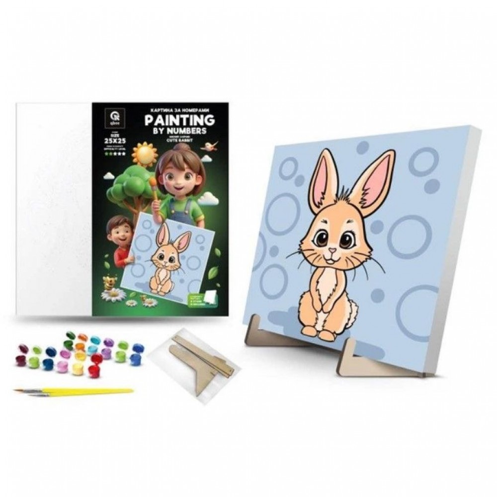 Дитяча картина за номерами. Для того, щоб намалювати картину, необхідно малювати за пронумерованими контурами, які відповідають кольору фарби. У наборі: полотно на підрамнику з галерейною натяжкою, художні нейлонові пензлі, палітра акрилових фарб у контейнерах, деревʼяні деталі підставки для картини. Усі необхідні фарби вже в комплекті та не вимагають змішування. Розмір: 25х25 см. Рекомендовано для дітей старше 5 років.