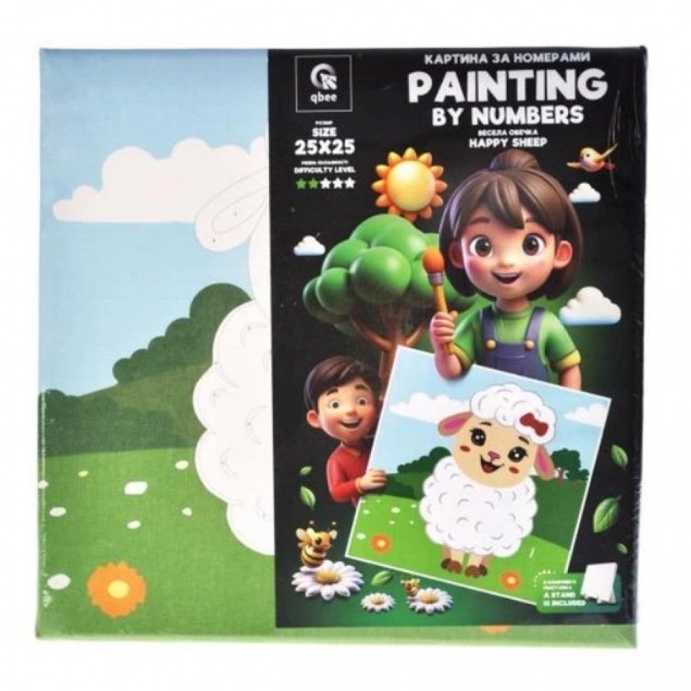 Дитяча картина за номерами. Для того, щоб намалювати картину, необхідно малювати за пронумерованими контурами, які відповідають кольору фарби. У наборі: полотно на підрамнику з галерейною натяжкою, художні нейлонові пензлі, палітра акрилових фарб у контейнерах, деревʼяні деталі підставки для картини. Усі необхідні фарби вже в комплекті та не вимагають змішування. Розмір: 25х25 см. Рекомендовано для дітей старше 5 років.