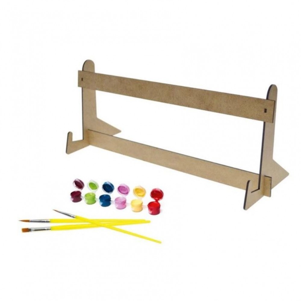 полотно на підрамнику з галерейною натяжкою, художні нейлонові пензлі, палітра акрилових фарб у контейнерах, дерев'яні деталі підставки для картини.