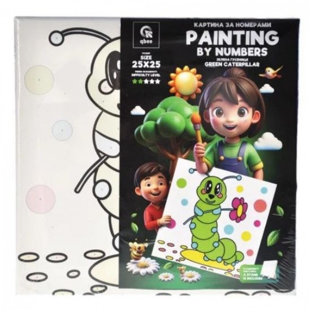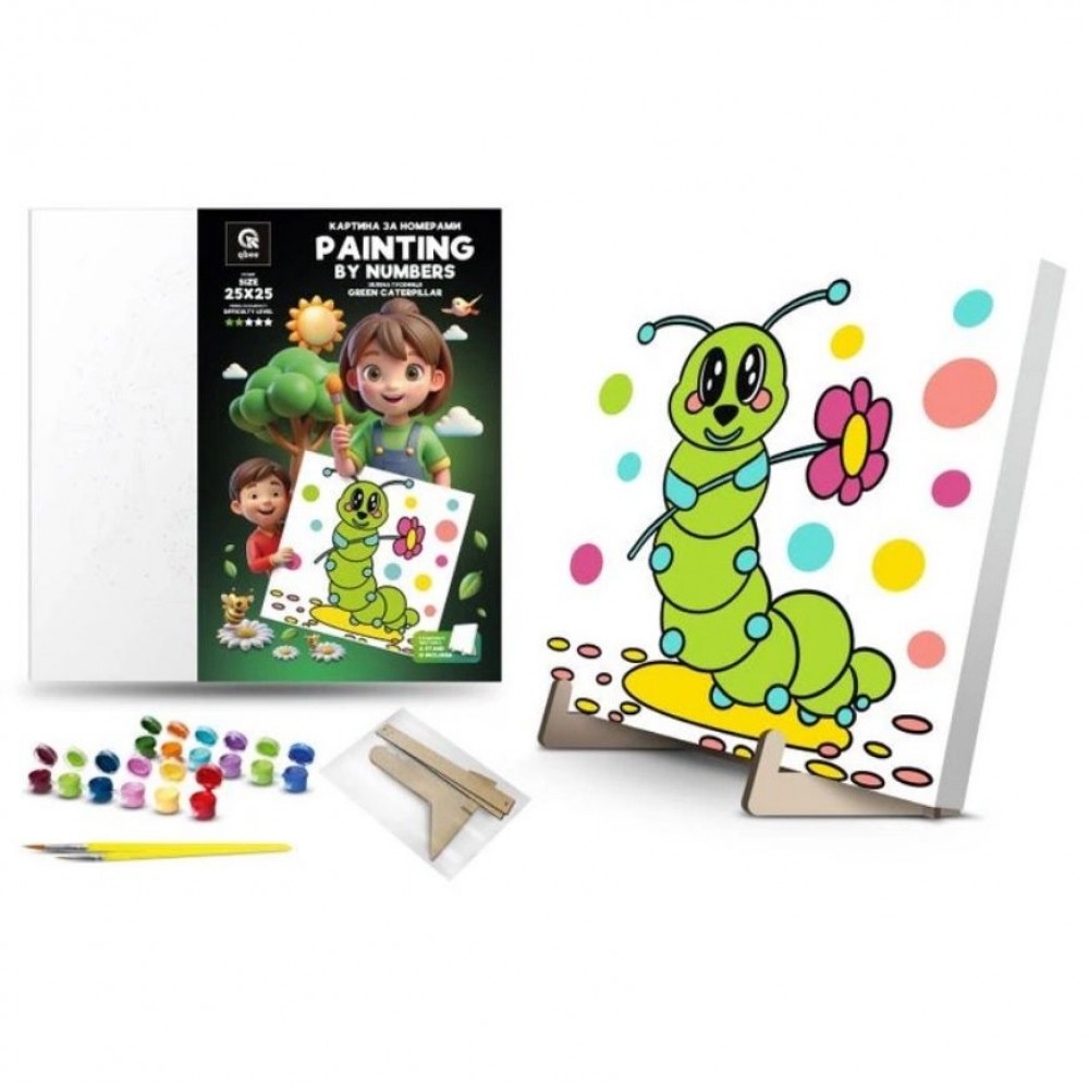 Дитяча картина за номерами. Для того, щоб намалювати картину, необхідно малювати за пронумерованими контурами, які відповідають кольору фарби. У наборі: полотно на підрамнику з галерейною натяжкою, художні нейлонові пензлі, палітра акрилових фарб у контейнерах, деревʼяні деталі підставки для картини. Усі необхідні фарби вже в комплекті та не вимагають змішування. Розмір: 25х25 см. Рекомендовано для дітей старше 5 років.
