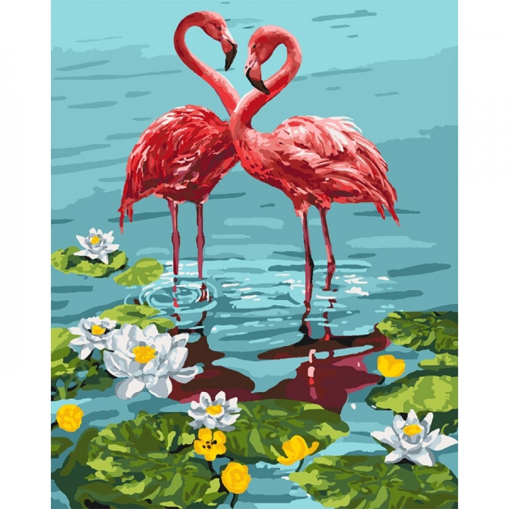 Картина за номерами "Пара фламінго". Для того, щоб намалювати картину, необхідно малювати по пронумерованим контурам, які відповідають кольору фарби. У наборі: натуральне полотно на підрамнику з галерейного натяжкою, паперова дублікат з контурним малюнком картини (на картині нанесена схема контурів зображення з нумерацією), 3 нейлонові художні кисті, палітра акрилових фарб в контейнерах. Всі необхідні фарби вже в комплекті і не вимагають змішування. Розмір: 40 х 50 см. Кількість кольорів: 30. Складність - ★★★★.