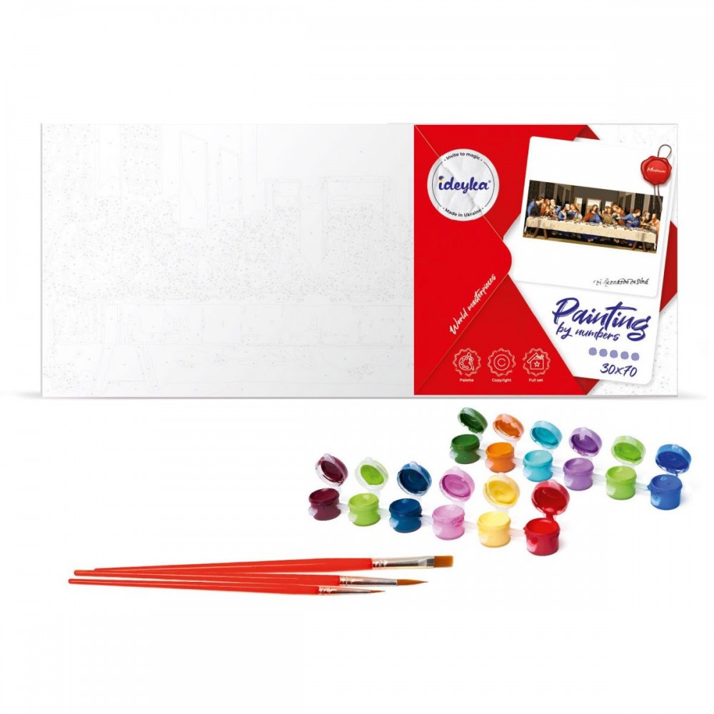 Картина за номерами. Для того, щоб намалювати картину, необхідно малювати за пронумерованими контурами, які відповідають кольору фарби. У наборі: полотно на підрамнику з галерейною натяжкою, паперовий дублікат з контурним малюнком картини (на картині нанесена схема контурів зображення з нумерацією), художні нейлонові пензлі, палітра акрилових фарб у контейнерах. Усі необхідні фарби вже в комплекті та не вимагають змішування. Розмір: 30х70 см.