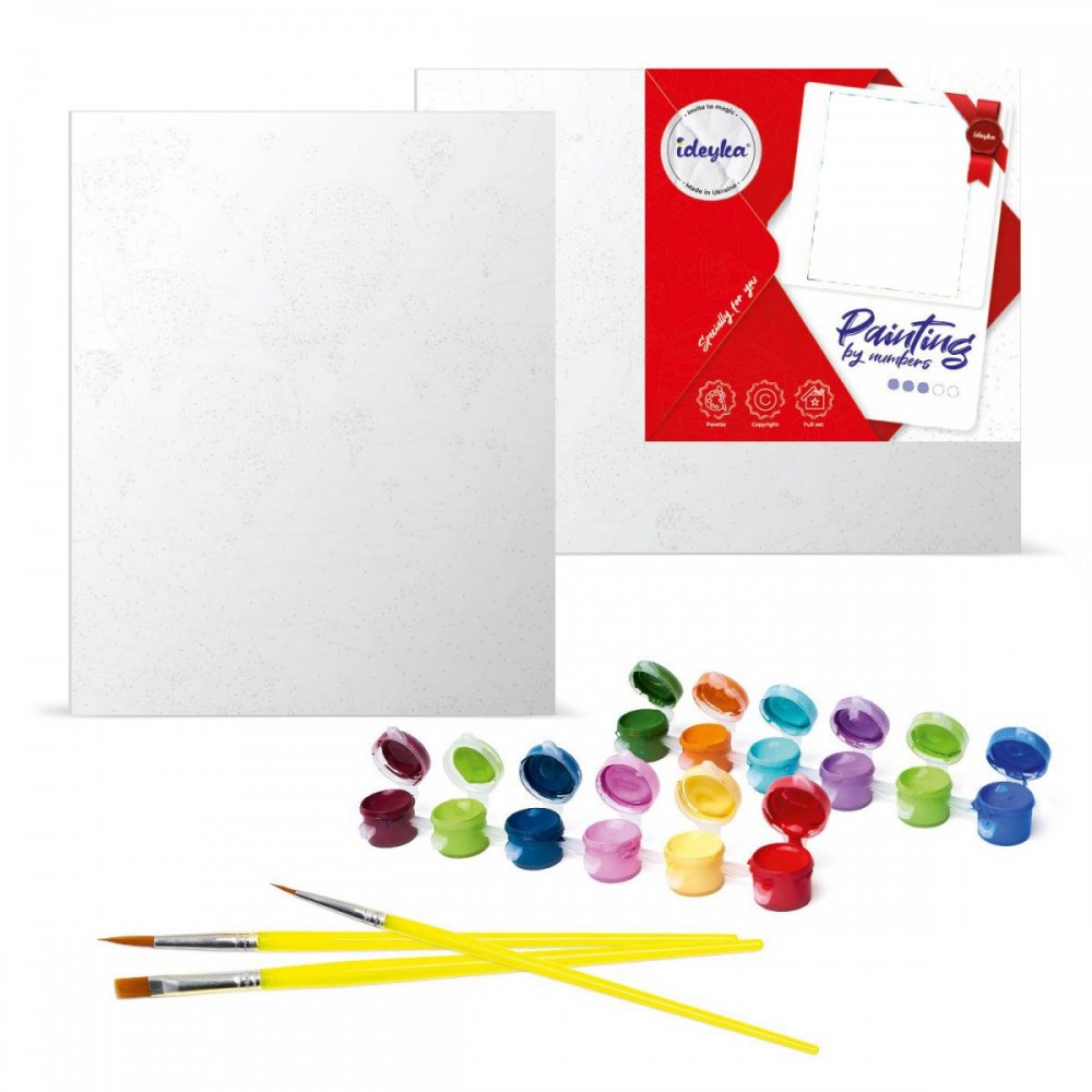 Полотно на підрамнику з галерейного натяжкою, паперова інструкція з контурним малюнком картини, нейлонові кисті, палітра акрилових фарб в контейнерах, кріплення
