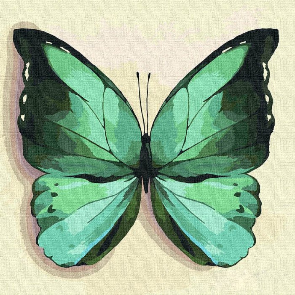 Картина за номерами "Зелений метелик". Для того, щоб намалювати картину, необхідно малювати по пронумерованим контурам, які відповідають кольору фарби. У наборі: натуральне полотно на підрамнику з галерейною натяжкою, паперова дублікат з контурним малюнком картини (на картині нанесена схема контурів зображення з нумерацією), 2 нейлонові художні кисті, палітра акрилових фарб в контейнерах. Всі необхідні фарби вже в комплекті і не вимагають змішування. Розмір: 25 х 25 см. Кількість кольорів: 23. Складність - ★★★.