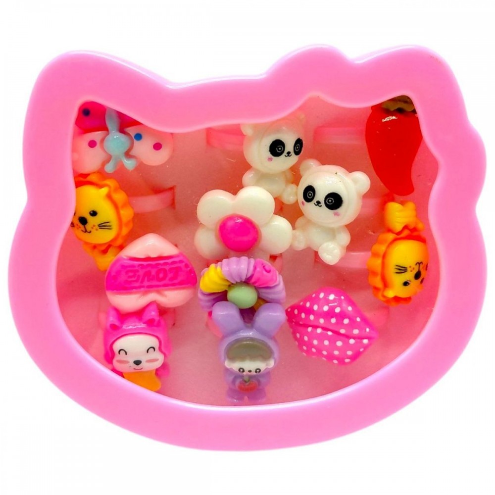 Набір складається з 12 дитячих пластикових кілець із декоративними елементами різної форми. Усі прикраси розміщені в подарунковій коробці, що робить набір привабливим для вручення.