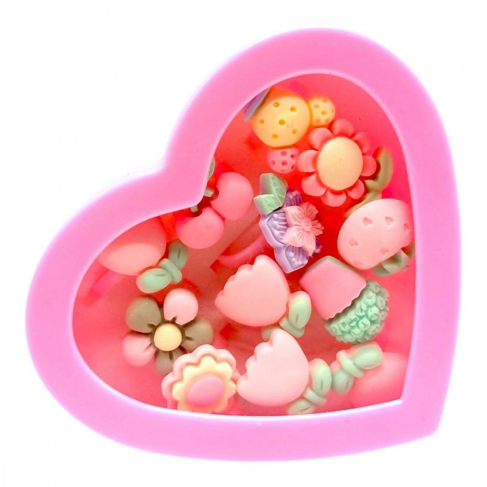 Набір складається з 12 дитячих пластикових кілець із декоративними елементами різної форми. Усі прикраси розміщені в подарунковій коробці у формі серця, що робить набір привабливим для вручення.