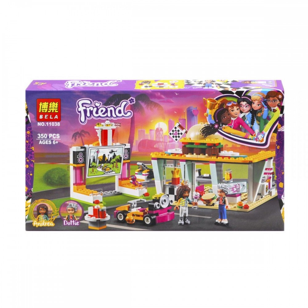 Конструктор "Friends: Пересувний ресторан", 350 деталей. Конструктор дає можливість побудувати придорожнє кафе, яке обслуговує офіціантка Дотті. На стоянці біля кафе припаркований болід, за кермом якого сидить Андреа. 2 мініфігурки в комплекті.