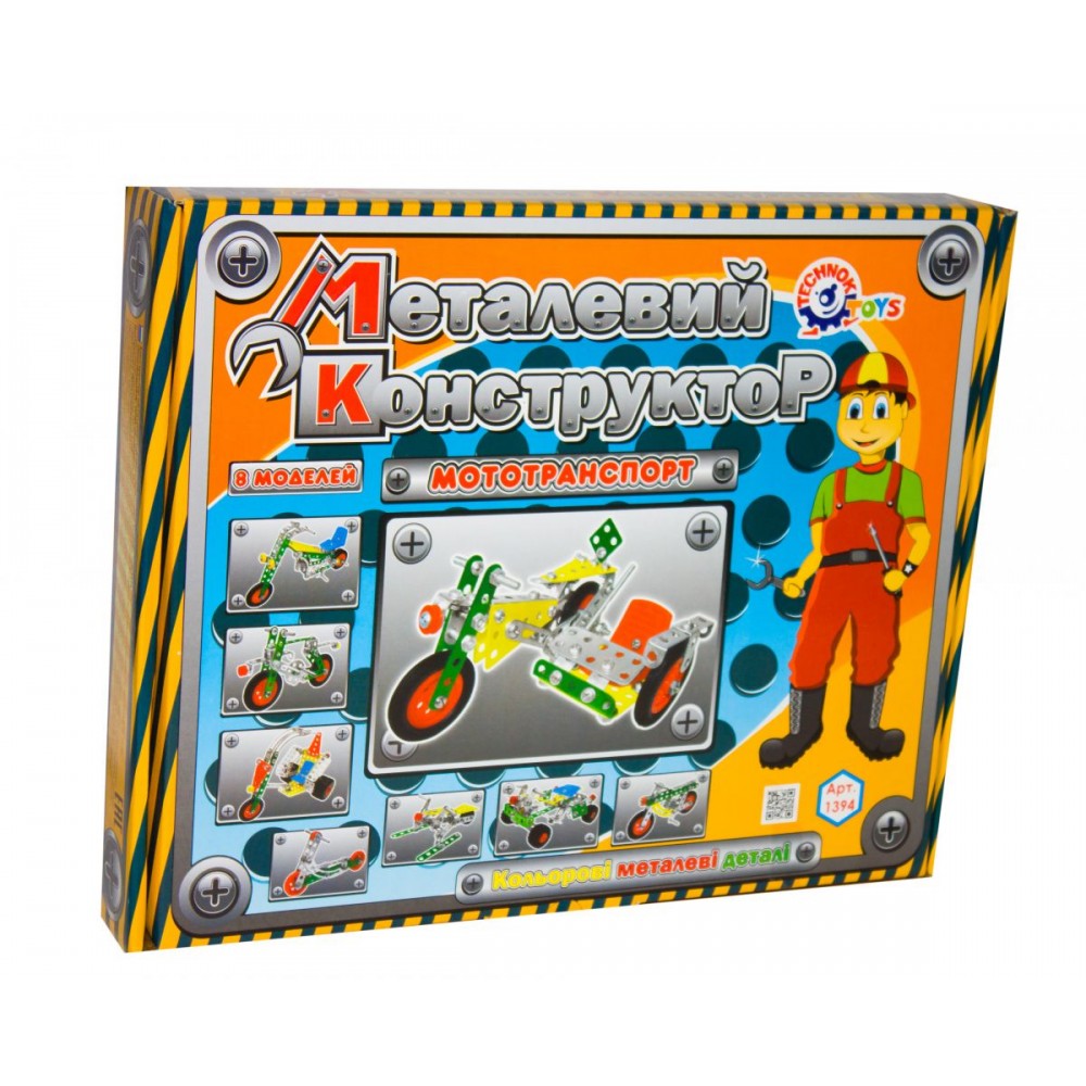 Конструктор металевий "Мототранспорт". 198 деталей в комплекті (гвинтики, планки, гайки, вилки, кермо, колеса, ключі, викрутка і ін.). 8 різних моделей для збирання, покрокова інструкція.
