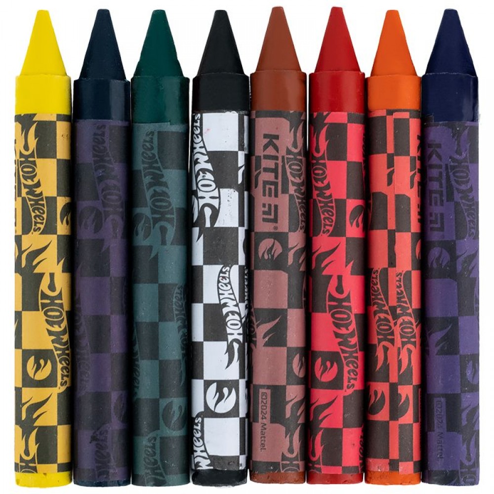 Кольорова воскова крейда Kite Jumbo «Hot Wheels» в яскравій картонній упаковці. Набір має таку палітру: помаранчевий, червоний, синій, чорний, жовтий, зелений, фіолетовий і коричневий кольори. Крейда яскрава та насичена, має однорідну текстуру, не кришиться. Малює яскраво без натиску. Воскова крейда легко заточується. Вона призначена для малювання на папері. Дитячу крейду приємно та зручно тримати в руках (довжина виробу 100 мм, діаметр - 12 мм.), корпус захищений папером - не мажеться і не вислизає з рук. Воскова крейда зроблена з натурального воску з додаванням фарб. Крейда має нейтральний запах. Продукція пройшла гігієнічні дослідження і не містить шкідливих речовин. Рекомендовано дітям дошкільного та шкільного віку.
