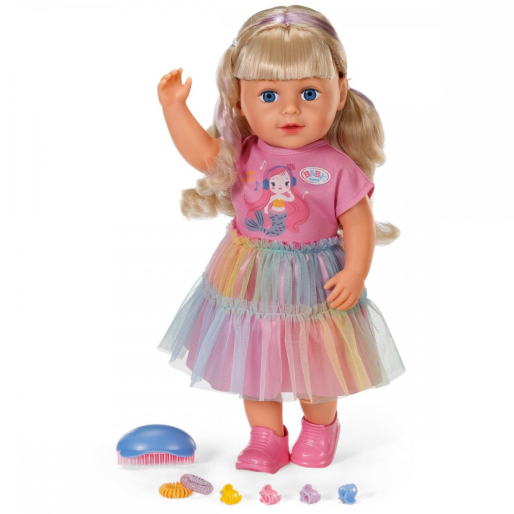 Знайомтеся з Карлою – це яскрава героїня нового мультсеріалу, створеного за мотивами ляльок всесвіту BABY Born. Карла – стильна, життєрадісна та енергійна дівчинка, яка обожнює танці та завжди дарує гарний настрій своїм друзям. Вона одягнена в різнокольорову спідницю, рожеву кофтинку з русалочкою та легінси, а її довге світле волосся можна розчісувати, прикрашати та вкладати у різні зачіски. Завдяки рухливим ручкам і ніжкам переодягати Карлу легко та весело. Вона любить купатися у ванній і завжди готова до нових пригод!
