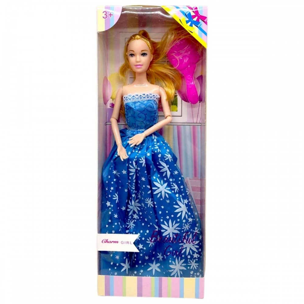 Лялька у святковій блакитній сукні з бантом — елегантна іграшка для сюжетних ігор. Модель має довге волосся, витончений образ та рухомі елементи, що дозволяють змінювати пози. Підходить для дітей від 3 років, сприяє розвитку уяви, емоційного сприйняття та інтересу до гри.