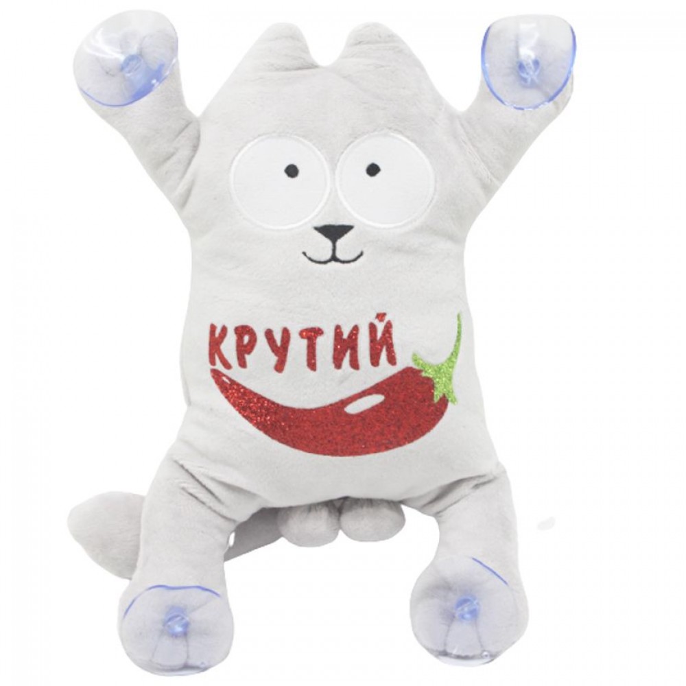 Іграшка відмінно підійде як подарунок чи прикраса у машину. Має присоски на лапках. Котик із написом "Крутий перець". Розмір іграшки 28х15х6 см.