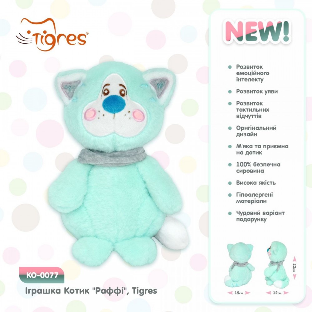 Іграшка Котик Раффі від українського бренду Tigres надзвичайно милий і обов’язково підкорить серця і малюків, і дорослих. Іграшка дуже м’яка та приємна на дотик, її не хочеться випускати з обіймів. Разом з котиком Раффі від бренду Tigres цікаво на прогулянках, під час веселих ігор, вдома та у подорожах. Під час гри малюк отримає радість і позитивні емоції, розвиває тактильні відчуття, фантазію та емоційний інтелект, вчиться гратись в сюжетно-рольові ігри.