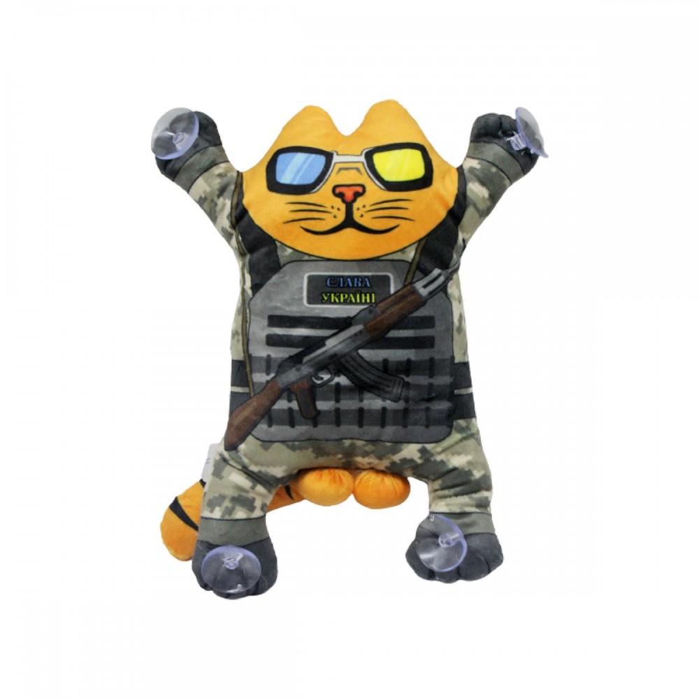 Іграшка відмінно підійде як подарунок чи прикраса в машину. Має присоски на лапках. Котик із написом "Слава Україні" на бронежилеті. Розмір іграшки 28х15х7 см.